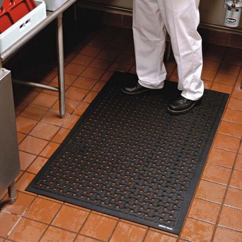 3/8" thick and constructed of 100% High Density Nitrile Rubber cushion, Comfort Flow Mat is far superior in grease and oil resistance than other "grease proof" mats. Meets all Americans with Disabilities Act standards. Non-skid backing, anti-microbial treated. Read More