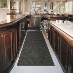 Cushion-Tred is made from a resilient rubber compound that can withstand many of the commonly found industrial chemicals, cutting fluids, oils, and greases. A large hole drainage system facilitates the removal of liquid and debris from the work area. Multiple mats can be affixed together with optional connector strips.